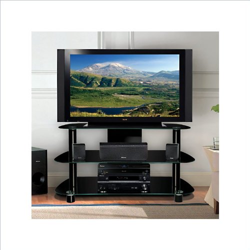 This contemporary design with front column legs features a scratch resistant, powder-coated black steel frame and elegant black rounded tempered safety glass shelves. It accommodates most Flat Panel Plasma or LCD TVs up to 44", plus at least 4 audio video components and a center channel speaker. An integrated CMS Cable Management System hides unsightly wires and interconnect cables.